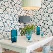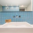 El baño, con originales azulejos en tonos azules, incluye lavabo, inodoro y toallas limpias, además de una bañera para tu confort.