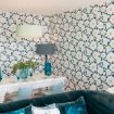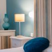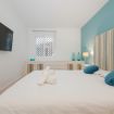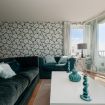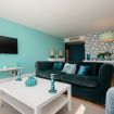 Al entrar, te recibe un amplio y luminoso salón decorado con un estilo elegante y sencillo. El salón cuenta con sofás de color turquesa, una smart TV y grandes ventanales que conectan directamente con la terraza privada, donde disfrutarás de vistas al puerto deportivo y al mar.