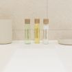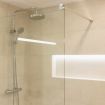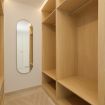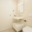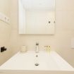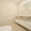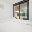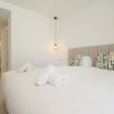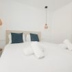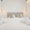 Los dos dormitorios, al igual que toda la propiedad, comparten un estilo moderno y minimalista, acentuado por los colores claros, los materiales utilizados y las ventanas del suelo al techo. El dormitorio principal tiene una cama doble, un cuarto de baño en suite con tocador doble, una smart TV y un amplio vestidor. El dormitorio secundario también tiene una cama doble, pero cuenta con un armario empotrado y acceso a un cuarto de baño adyacente. Ambos cuartos de baño están equipados con amplias duchas a ras de suelo.