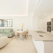 Al entrar en el apartamento, le recibe un amplio y luminoso salón-comedor-cocina elegantemente amueblado con un cómodo sofá, un elegante sillón, una mesa de centro y un televisor inteligente. Además, contiene una mesa de comedor redonda con capacidad para 4 personas y la cocina, totalmente equipada con electrodomésticos modernos: frigorífico, placa de inducción, horno, microondas, lavavajillas, cafetera y toda la vajilla necesaria. Esta habitación familiar goza de abundante luz natural gracias a los ventanales que se abren a la gran terraza privada de la propiedad.