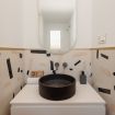 En la planta baja, nos encontramos un espacioso salón-comedor, el cual está irradiado de luz natural que entra de forma directa desde la magnifica terraza. El salón se ha decorado con un mobiliario elegante y confortable, cuidadosamente elegido para ofrecer una experiencia de descanso y estilo. El chaise longue tiene capacidad para 6 personas y es muy cómodo, ideal para disfrutar días de película con los más de 1.000 canales internacionales que cuenta la smart TV y la chimenea eléctrica que da un toque acogedor. El comedor cuenta con una preciosa mesa de madera con capacidad para seis personas, cuatro sillas y un banco que invitan a pasar las mejores veladas en familia o con amigos.