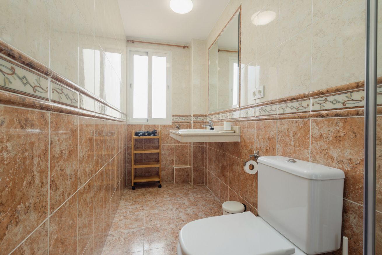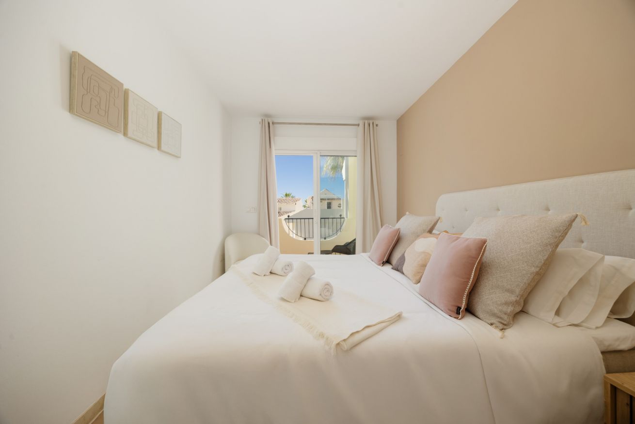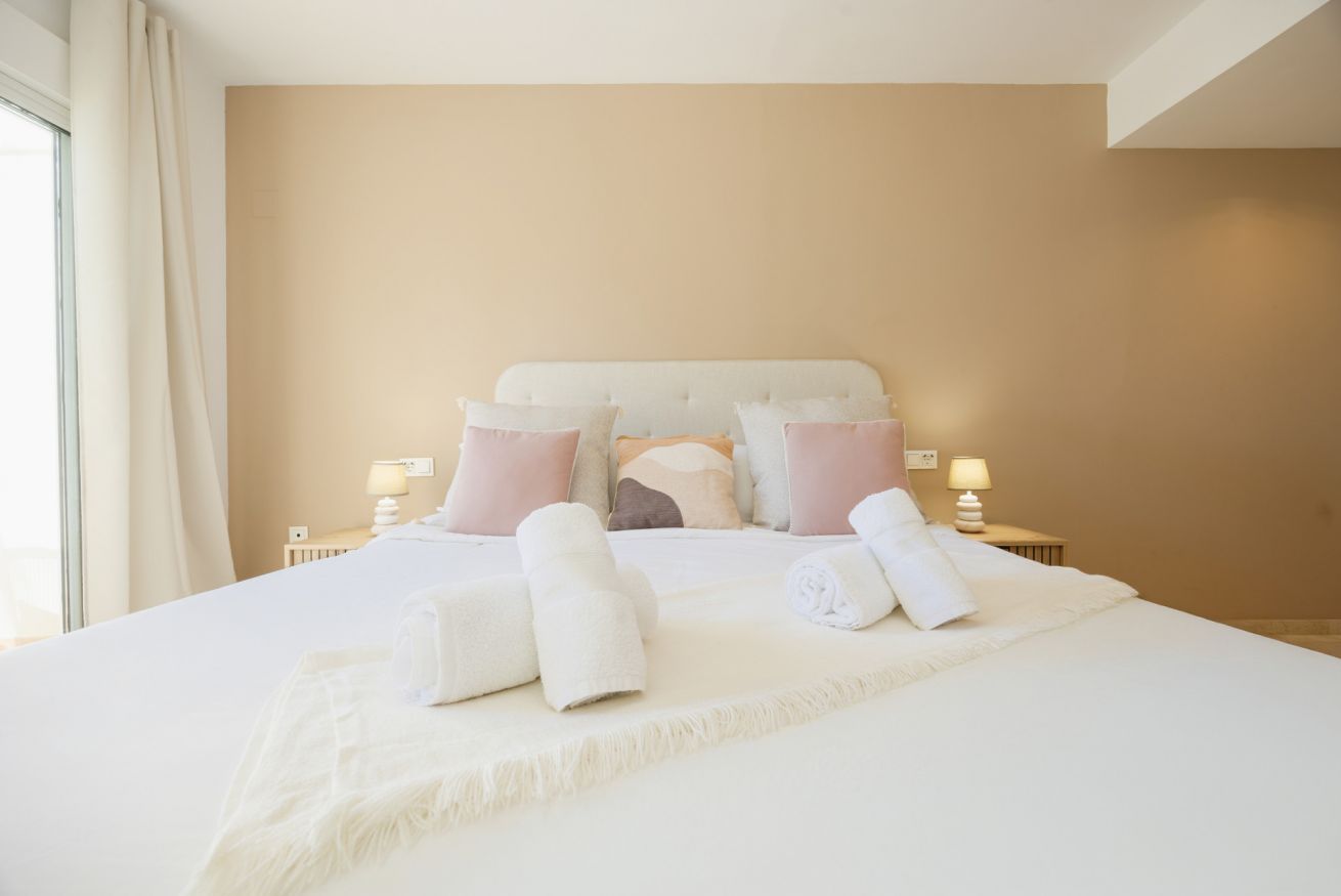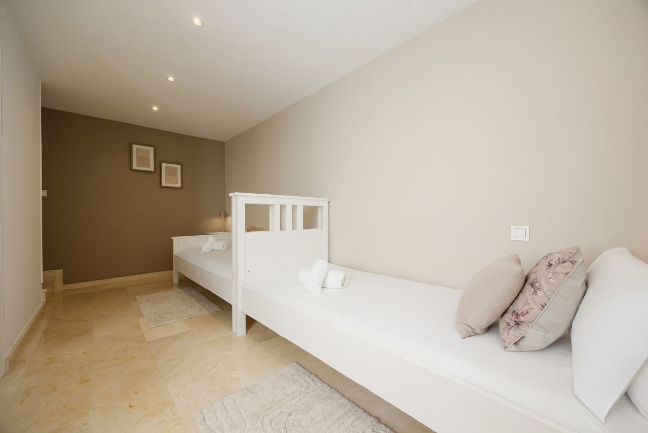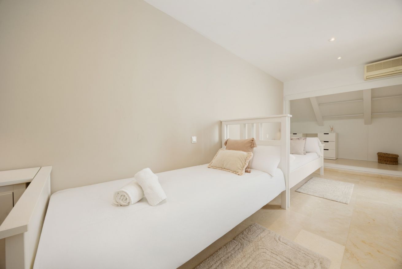 La tercera planta está reservada exclusivamente para el dormitorio principal, con otras dos camas individuales extralargas, aire acondicionado independiente, un baño con ducha y un balcón con preciosas vistas a las piscinas de la urbanización El Arenal y al mar. Este dormitorio incluye ropa de cama y toallas.