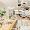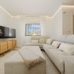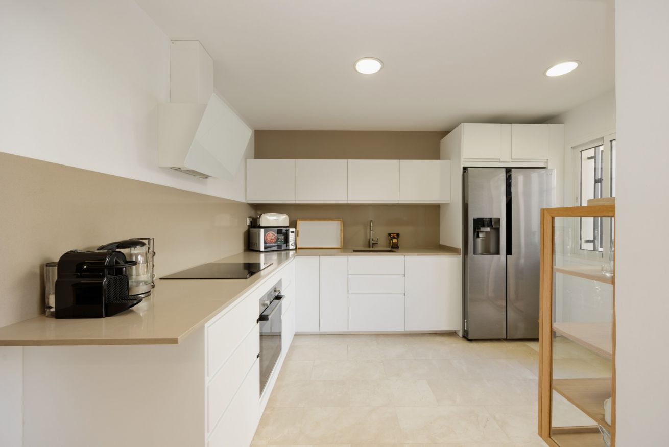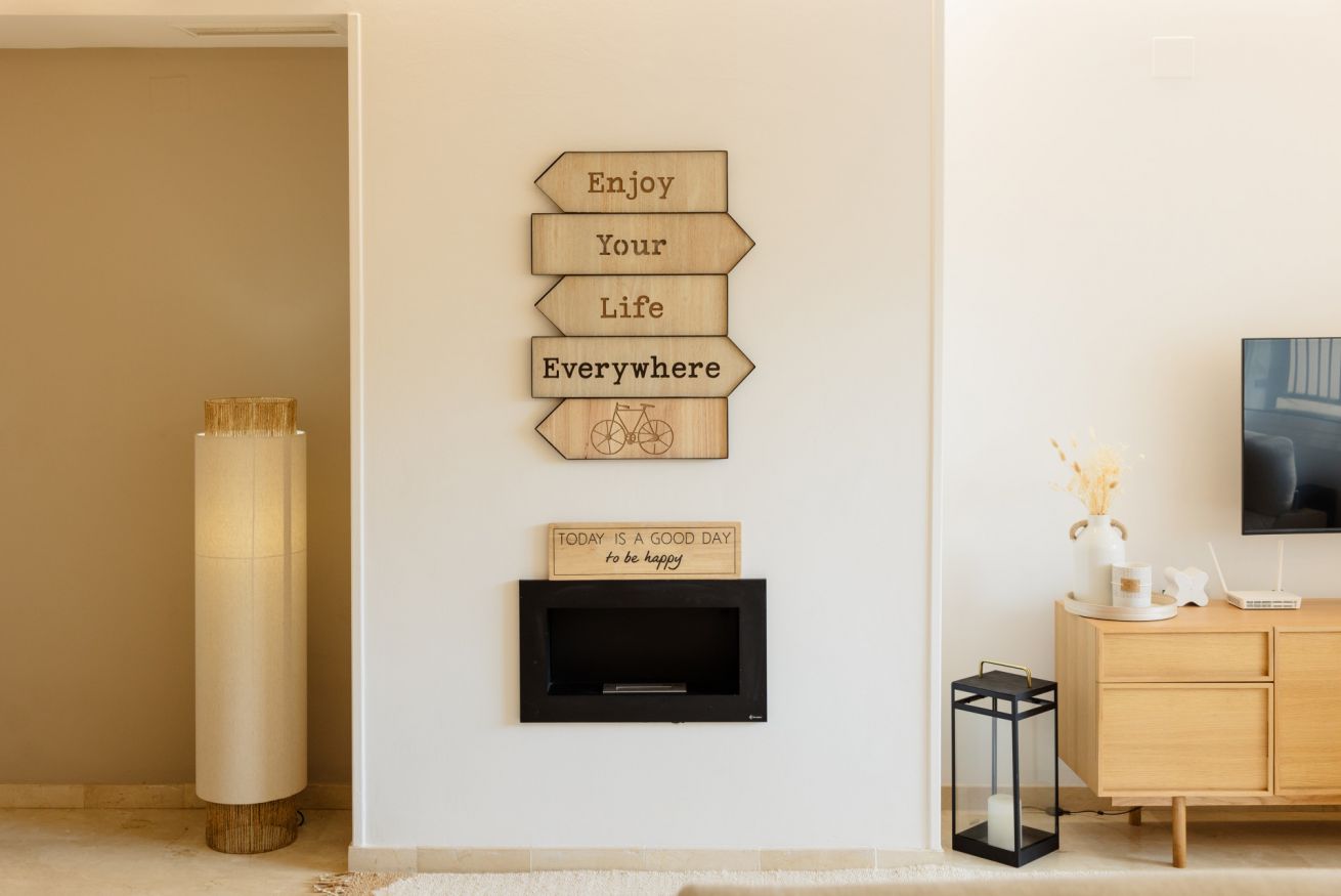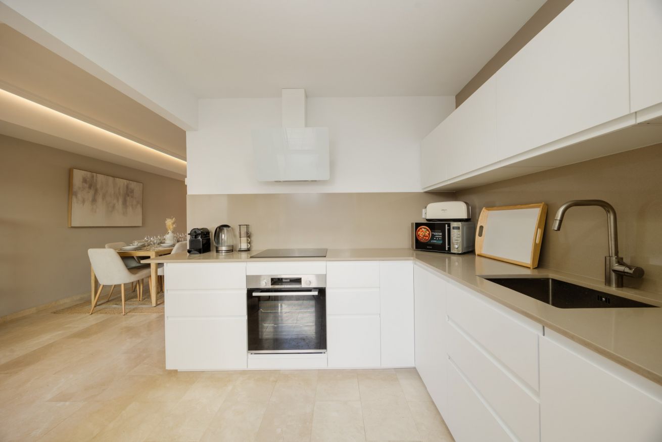 Al entrar, le da la bienvenida un moderno y acogedor espacio tipo "chill-out" con una mesita de madera. En el interior, encontrará un espacioso salón-comedor-cocina. El salón cuenta con un cómodo sofá en forma de L tipo chaise longue, situado frente a una Smart TV con acceso a canales internacionales.